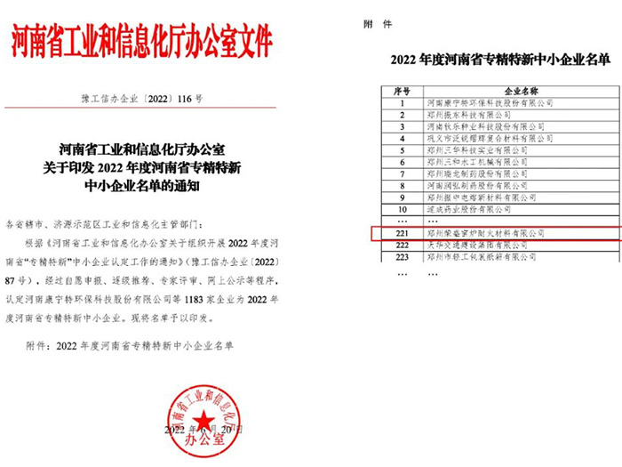 近日,河南省工業(yè)和信息化廳公布了《河南省工業(yè)和信息化廳辦公室關(guān)于印發(fā)2022年度河南省“專精特新”中小企業(yè)名單的通知》。經(jīng)省工業(yè)和信息化廳組織評(píng)審,鄭州榮盛窯爐耐火材料有限公司被認(rèn)定為2022年度河南省“專精特新”企業(yè)。這是繼榮獲“高新技術(shù)企業(yè)”、“河南省科技型中小企業(yè)”后,榮盛耐材在科技創(chuàng)新領(lǐng)域獲得的又一殊榮。