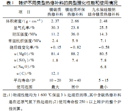 表1:轉爐不同類型熱修補材料的典型理化性能和使用情況