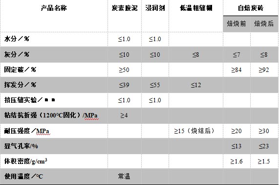 表1炭素膠泥.浸潤劑.低溫粗縫糊和自焙炭磚的理化指標