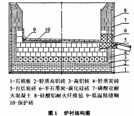 1)爐體材料規(guī)格.品種和質(zhì)量應(yīng)符合標準要求。特別是鐵出口處的半石墨炭一碳化硅磚,須進行異形精加工,并給出爐襯結(jié)構(gòu)圖(見圖1)。
