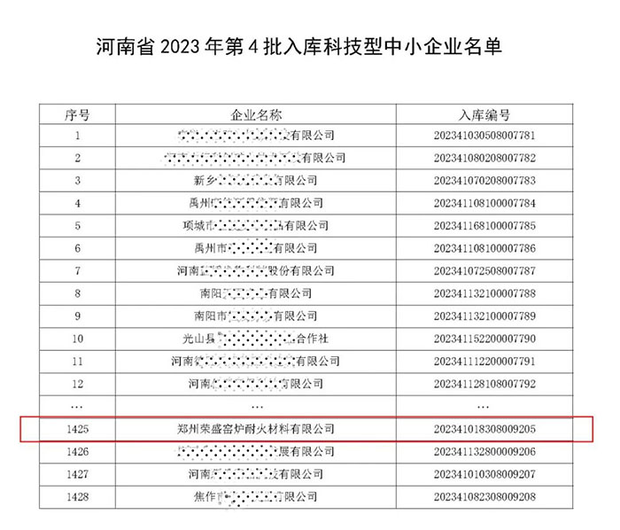 近日,根據科技部、財政部、稅務總局《科技型中小企業評價辦法》和《科技型中小企業評價服務工作指引》的有關規定,經評估機構的嚴格審核,鄭州榮盛窯爐耐火材料有限公司成功入庫“科技型中小企業”。這是榮盛耐材在自主創新、自主研發的進程中取得的又一豐碩成果。
