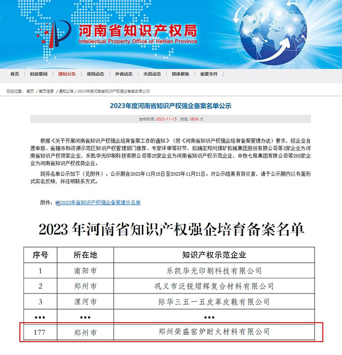 近日,河南省知識產(chǎn)權(quán)局公布2023年度河南省知識產(chǎn)權(quán)強(qiáng)企備案名單,鄭州榮盛窯爐耐火材料有限公司(以下簡稱「榮盛耐材」)榮獲「知識產(chǎn)權(quán)優(yōu)勢企業(yè)」稱號,知識產(chǎn)權(quán)綜合實(shí)力獲官方認(rèn)可。這是今年以來,榮盛耐材在知識產(chǎn)權(quán)領(lǐng)域獲得的又一項(xiàng)榮譽(yù)。
