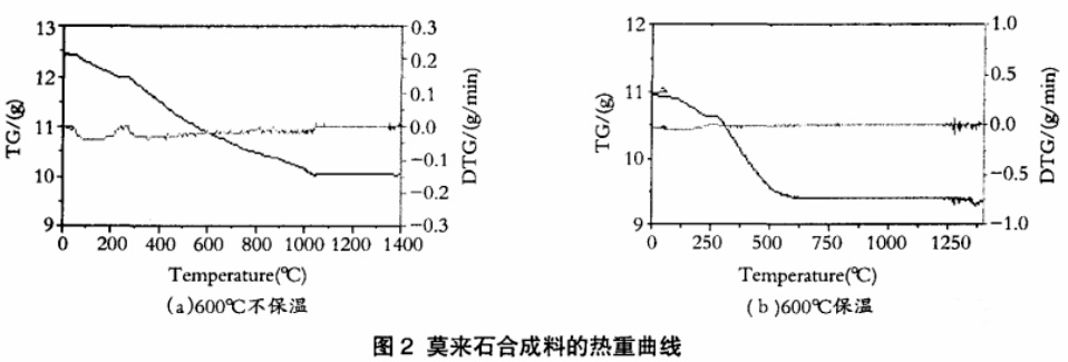 由于DSC-TG分析的測(cè)量用料量大多≤100mg,并且要磨成細(xì)粉。這種實(shí)驗(yàn)方法很難代表混合料實(shí)際的情況,且缺乏均勻性和代表性,從動(dòng)力學(xué)上也不能反映澆注料加熱過程的實(shí)阮變化情況。目前對(duì)于尺寸和質(zhì)量大的試樣,只能通過試樣加熱前后質(zhì)量的變化來表征總的反應(yīng)情況。用整體的樣塊大試樣加熱更接近真實(shí)。大試樣熱重儀對(duì)烘干后的試樣進(jìn)行熱重分析,測(cè)定室溫至1400℃過程中重量的變化,結(jié)果如圖2(a)所示。由圖可知,在連續(xù)加熱不保溫的情況下,質(zhì)量一直到1100℃才保持穩(wěn)定。根據(jù)DSC-TG及大試樣熱重分析結(jié)果,混合料在1200℃以上均可生成莫來石,只是莫來石的生成速度和轉(zhuǎn)化率隨溫度不同而會(huì)有所差異。本工作的主要目的是合成具有微孔結(jié)構(gòu)的莫來石骨料,既要求合成料有一定的氣孔率,孔徑小、體密輕,又要求其強(qiáng)度高,即要有理想的莫來石轉(zhuǎn)化率,同時(shí)還要兼顧煅燒設(shè)備投資、生產(chǎn)成本等,因此摸索理想熱處理制度對(duì)本工作而言至關(guān)重要。