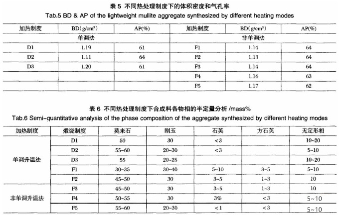 兩系列不同熱處理制度下輕質(zhì)莫來石合成料的體積密度和顯氣孔率如表6所示。